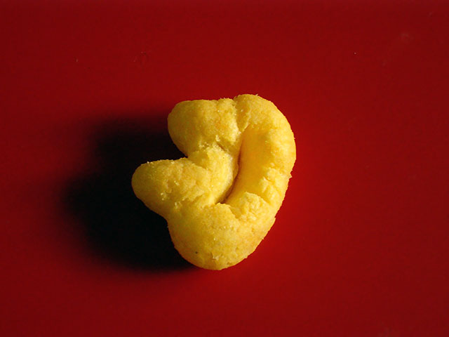 カール のチーズ味を独り我が物顔で食べていると、なにやら不思議な形のカールを発見。どこから見ても見紛う事無き カエルのケロ太 君です!