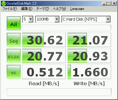 チップセットの仕様上、U-ATA33 接続なので、30 [MB/s] くらいで頭打ちなのはしょうがない。