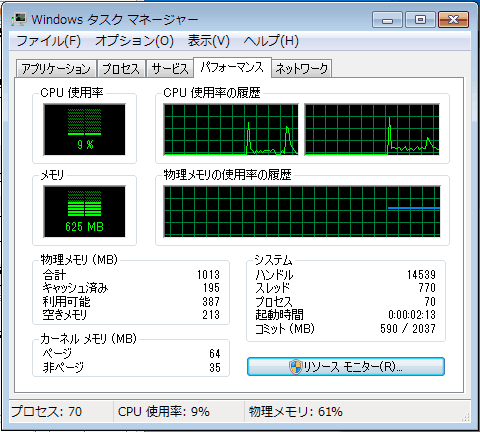 起動直後にタスクマネージャーで確かめたところ、210MB くらいの空き。