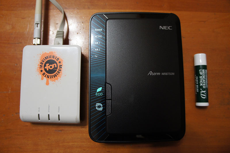 今まで使っていた FONルーター と並べてみました…が、大きさがイマイチわかりにくかったので、リップクリームも一緒に撮ってみました。