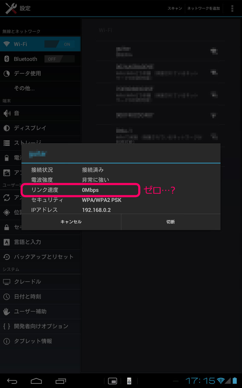 OS のせいなのか? [0Mbps] との表示。