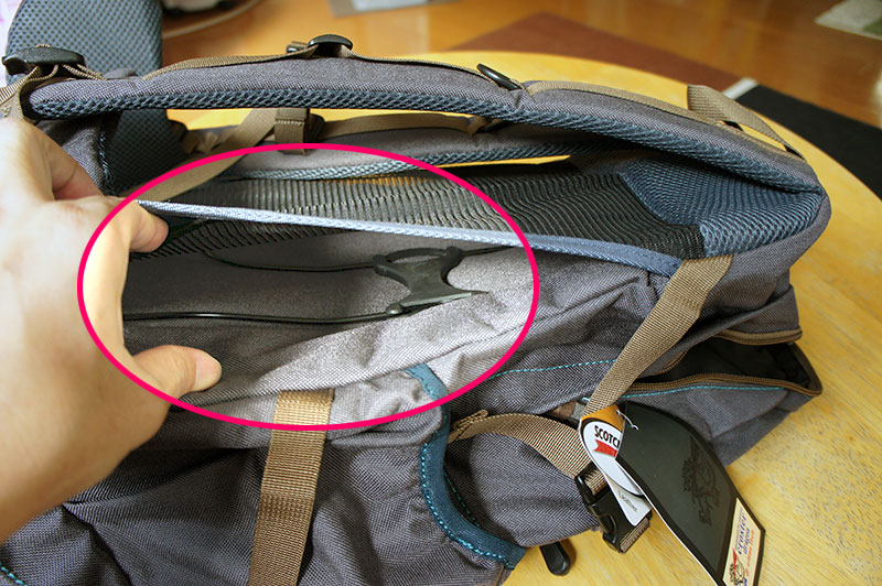 リュック側の背面を金属フレームで支えて、背中とリュックとの間に隙間を作る構造になっています。