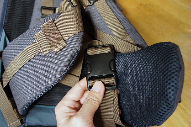 - チェストベルト (胸の前でつなぐ、肩への負担を軽減するベルト)