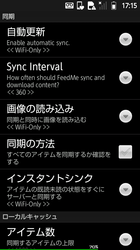 自動更新の有効・無効やタイミング、キャッシュ方法(WiFi時のみとか)、保持期間、フォントや記事の文字の大きさ、配色(2パターン)などなどが調整可能。